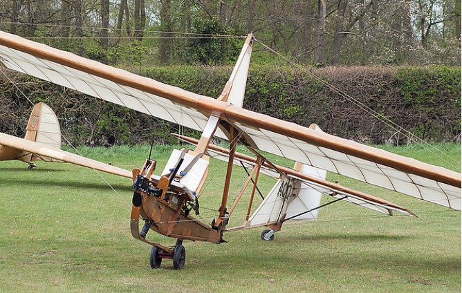 The constant chord wooden wing is wire-braced and has a high lift section of 12% thickness/chord ratio; it has a plywood leading edge and fabric covering, with fabric-covered wooden ailerons. Plywood leading edge spoilers are featured for use during ground-slides only. The fuselage is a flat wooden open girder-type structure supported by a horizontal beam with the landing skid underneath, with sprung compression legs; the pilot has a single open seat with minimum controls. Unlike the Dagling and Slingsby Primary, the EoN design did not have the option of a nacelle to provide some protection for the pilot. The tail unit is of fabric covered wooden construction and strut and wire braced, effective fin area being provided by filling in part of the open rear fuselage in front of the rudder.