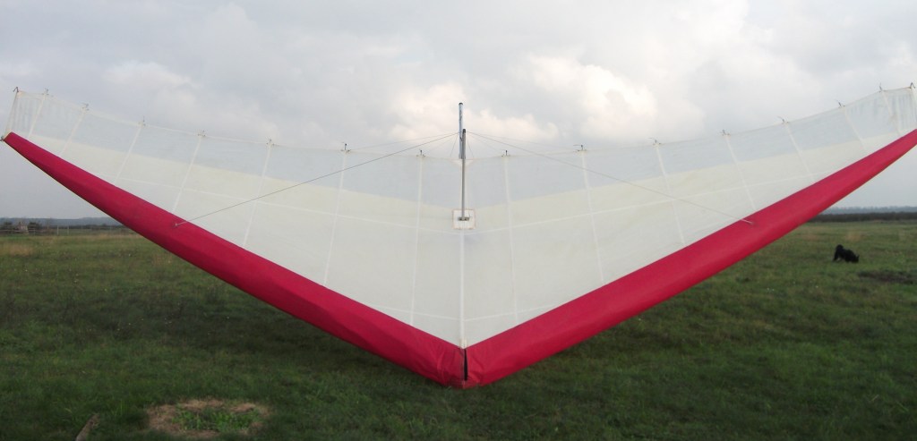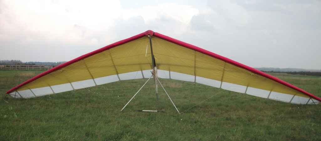 A 1983 hang glider. The airframe tubing is 7075 T6 alloy. The keel is 42×0.9 mm, with 44×0.9 sleeves. The crossbar is 52×0.9, with 50×0.9 inner sleeve (about 1.2 m long). The leading edge – nose to crossbar-LE junction – is 42×0.9 with 44×0.9 sleeve and 40 mm inner sleeve. Crossbar-LE to end: 44×0.9 with 46×0.9 sleeve.