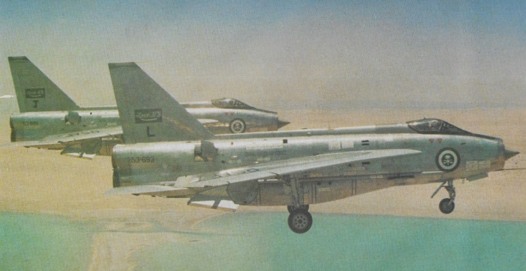 The T.4 was a dual control side by side Mk 1A; the T.5 was a dual control Mk 3; and the Mk 6 was the result of common ¬sense finally creeping into the minds of the Air Staff. With the Mk 6 BAC, as the company had become in 1960, were allowed to fit a proper fuel system, with roughly double the capacity of the early versions. One visible manifestation of this was the area ruled ventral bulge, housing 600gal, which could also carry twin 30mm Aden guns or other stores (the original nose guns had been left off and then later put back again) and overwing pylons for twin 260gal ferry tanks or force ejected retarded bombs. The Mk 6 also, at last, got the improved wing. The F.6 entered service during August 1966 and remained operational until 30 June 1988. While Mk 3s were expensively modified to Mk 6 standard, in 1964 BAC were able to offer an export version (with racks for a 4,0001b load under wing), and sold F.53 and T.55 Lightnings to Saudi Arabia (which led to a further BAC assistance deal in 1972 73). Kuwait bought a smaller number.