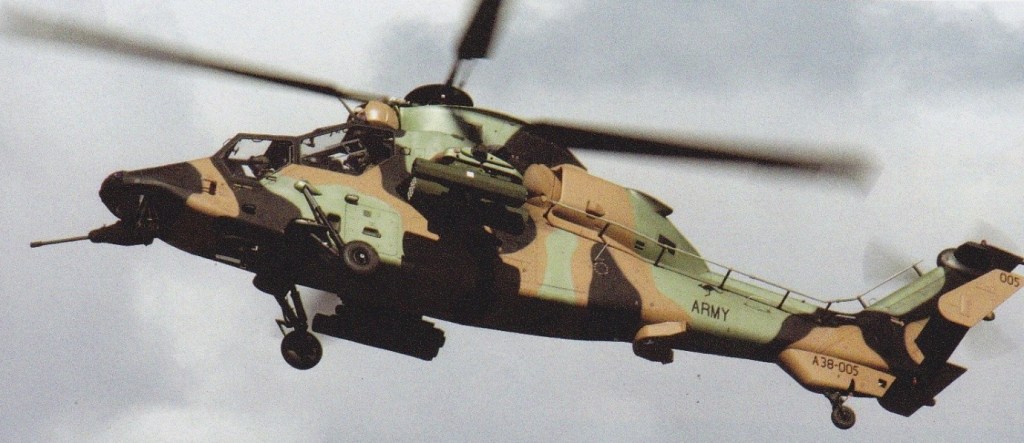 ARH Tiger (HCP): Hybrid Tiger variant to meet Australian Army Air 87 requirement. Based on French HAP, with undernose Giat 30-781 30mm cannon, roof-mounted sight and provision for underwing rocket pods, but with added anti-tank capability, initially with HOT missile then (from 2006) with Trigat AC3G. Australia also requires integration of the AGM-114 Hellfire ATM. Maximum mission weight of 6,100 to 6,300kg. A$1,300 million (US$674 million) contract for 22 signed 21 December 2001. First four from European production; remaining 18 to be assembled in Brisbane, beginning April 2003. First European deliveries (two) due December 2004; Australian-built deliveries between July 2005 and April 2008.