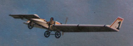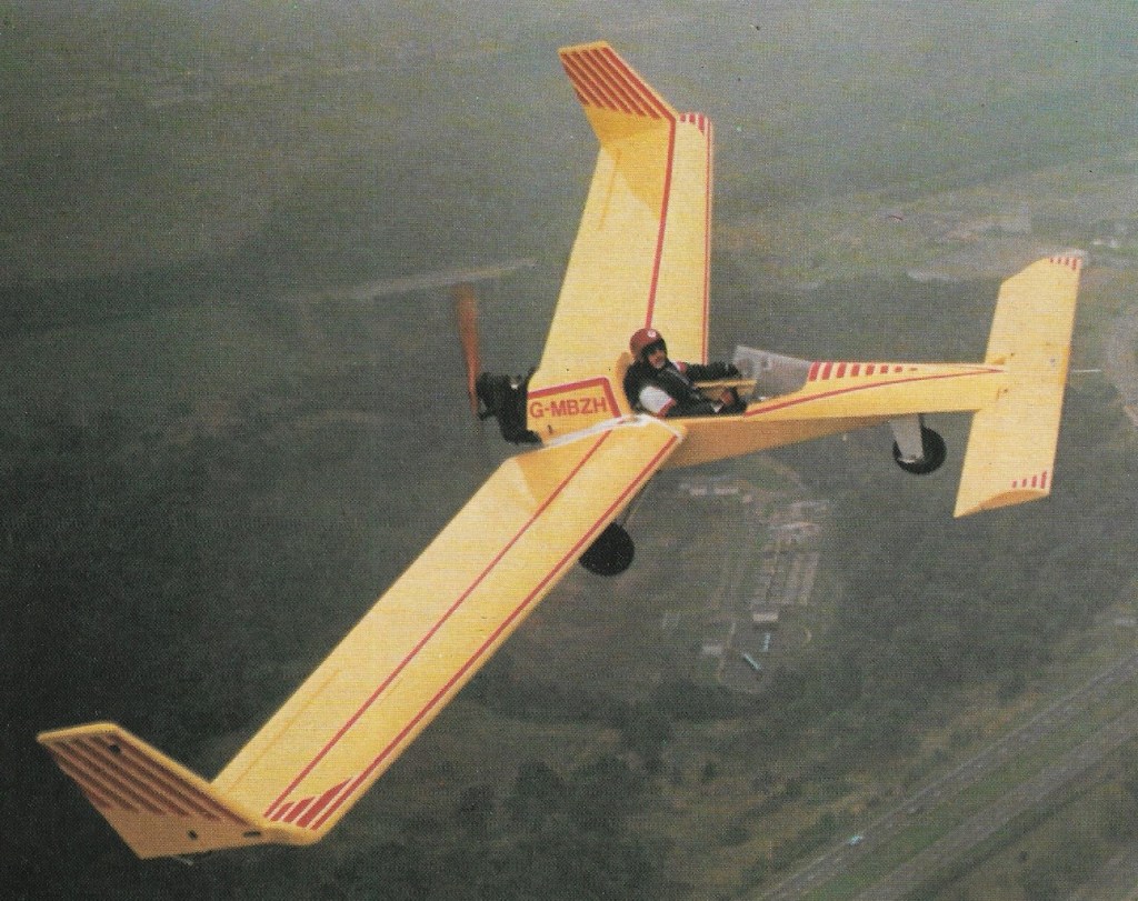 Single seat single engined mid wing monoplane with conventional three axis control. Wing has swept back leading and trailing edges, and tapering chord; no tail, canard wing. Pitch control by elevator on canard; yaw control by tip rudders; roll control by half-span up only ailerons and spoilers; control inputs through stick for pitch/roll and pedals for yaw. Cantilever wing; main wing profile, modified Liebeck; canard profile, GU25; both double surface. Undercarriage has three wheels in tricycle formation; no suspension on nosewheel and glass fibre suspension on main wheels. Push right go right nosewheel steer-ing connected to yaw control. No brakes. Aluminium tube glass fibre fuselage, partially enclosed. Engine mounted above wing driving pusher propeller.