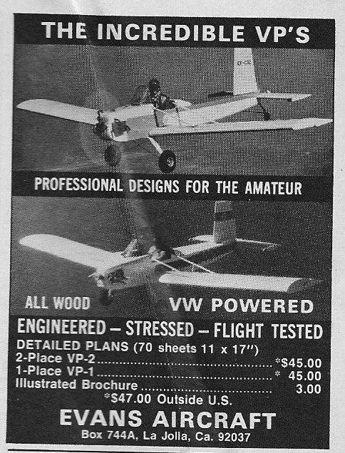 Following the success of the Volksplane VP-1, Evans designed the VP-2, capable of carrying two persons side by side. Construction is generally similar to the VP-1. The fuselage is of rectangular cross-section and consists of four wooden longerons, bulkheads and plywood skin. A fibreglass fairing is located behind the open cockpit. The fuselage width at the cockpit is approximately 35 inches. The wing is made up of two solid spruce spars. wooden ribs, compression struts and internal wire bracing. Each wing panel is fabric covered and externally braced to the fuselage with streamline steel tube struts. No flaps are fitted. The airfoil section is NACA 4415. The rudder consists of wooden ribs clamped to an aluminium tube mounted vertically in the rear fuselage. The all moving tailplane is a wooden cantilever structure, consisting of a simple box spar to which are glued wooden ribs. Both tailplane and rudder are fabric covered. The main wheels are carried on bent wire braced 2024-T3 aluminium alloy legs which are bolted to the fuselage. Shock absorption is taken by low pressure 600 x 6” tyres. Fuel is carried in a moulded II Imperial gallon fibreglass fuel tank aft of the firewall. VW engines up to 65 h.p. (2100cc) may be installed. The VP-2 with a passenger aboard is designed for “normal category” use, which allows non-aerobatic operation and all maneuvers incident to normal flying. Without a passenger, Utility category use is permitted, which includes stalls, lazy eights, chandelles and steep turns with a bank angle of more than 60 degrees. Aerobatics are not approved in either the VP-1 or VP-2.