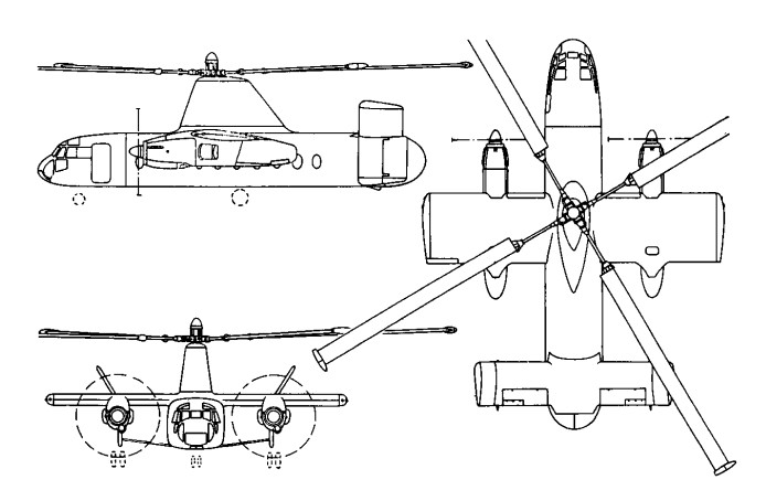 The Rotodyne was a square-section fuselage with untapered 14.17m stub wings on which were mounted two 3000shp Napier Eland turboprops for forward propulsion. The main wheels of the tricycle landing gear retracted forwards into the nacelles, and the nosewheel forwards below the cockpit. Twin fins and rudders, later joined by a central fin, were mounted on an untapered tailplane set on top of the rear fuselage. A large four-bladed rotor for vertical take-off and landing was driven by tip jets which received compressed air from the Eland engines via a compressor. To provide compressed air for the jets the two 2,800shp Napier Eland N.E1.7s operated as dual-purpose powerplants – acting either as normal propeller-turbines or as pressure-generators according to requirements. They were virtually normal Elands up to the rear of the turbine casing, where there was a nine-stage axial compressor driven by the power turbine through an hydraulic clutch. For take-off and landing most of the engine power was absorbed by the compressor, which delivered air to the internal duct system of the rotor. The small amount of remaining power of the engines went to the propellers for yaw control. In cruising flight all the power went to the propellers, with the rotor autorotating. Each engine fed air to two opposing blades so that, in the case of failure of one engine, there would be adequate pressure to keep two jets burning efficiently and giving maximum thrust.