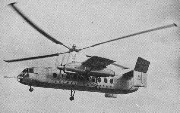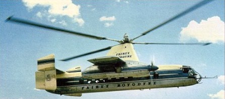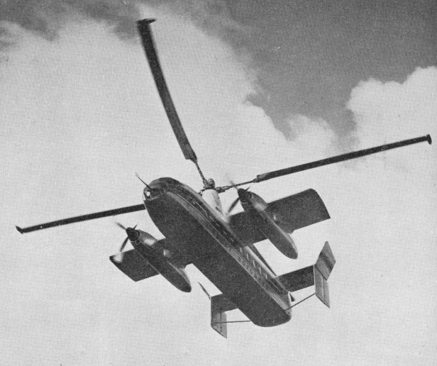 Later, when it was found that the economical cruising speed was more like 273km/h than the originally planned 209km/h, it was found that, at higher speeds, the wing was doing too much work and the rotor too little, so that the blades were flapping and the control margins were inadequate. The wing, originally set at an incidence of 4°, was re-set at 0° and fitted with ailerons, the operation of which was linked directly to the cyclic lateral control of the rotor. The outward-sloping upper fins were also moved to the vertical so as to reduce the rolling tendency with yaw. These changes produced a normal ‘aeroplane-type’ rolling control for the pilot, and the situation was further improved later by the fitting of a third upper fin.
