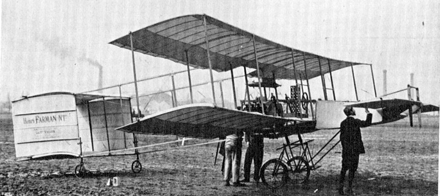Built for Farman by Voisin Frères, Charles and Gabriel – often referred to as the Voisin-Farman 1 or Voisin HF-1 – yet sometimes called the Farman HF-1, since after delivery from the Voisin Factory, Henry Farman made significant modifications to the machine. This Voisin-built Farman had no ailerons and no wing warping, the only thing to do was to fly a very steady level turn.