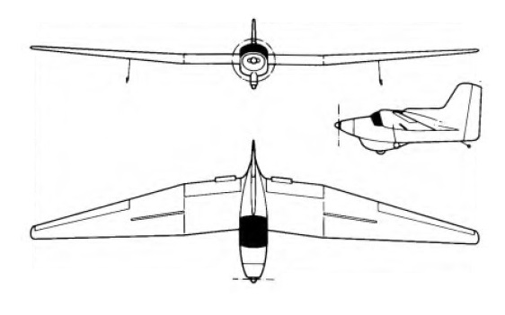 After having designed and flown the AV-221, Charles Fauvel developed a version for amateur construction, the AV-222. Lighter and of a less complex structure, this flying wing could be disassembled into three sections (the center section had no dihedral). It had a laminar airfoil (optional, or the more conventional Fauvel airfoil), and could be equipped with a choice of a classic landing gear or a mono-gear – a non-retractable monowheel from a Piper Cub in a large under-fuselage fairing supplemented by outrigger wheels under the wings and a small steerable tailwheel. Tthe last being the recommended one because it is lighter, more economical to fabricate and easier to install, and a single fin and rudder. The craft mounted either a Rectimo engine (40 HP), Limbach (60 HP) of Volkswagen origin, or the 2-cycle Rotax. The Rectimo and Limbach engines drive a two-blade fixed-pitch wooden propeller of 3ft 5.25in diameter. Fuel tanks could contain up to 30 liters (with 45 as an option).