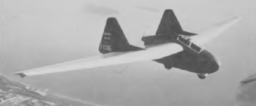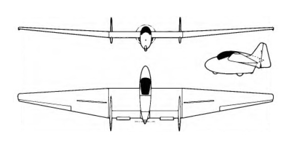 The Gross (Fauvel) AV 451, actually the first AV 451, was designed and built by Mons Francois Gross with his son’s help and is a modification of AV45 F-CCRM with the 15m wing span and new Wortmann wing section of the AV451, a longer fuselage modified in the cockpit area to take the canopy from a Grob Astir, and with a 38hp Rotax 642 two-cylinder two-stroke engine aft of the cockpit, driving a two-blade Hoffmann pusher propeller. It made its first flight in the beginning of September 1978. The cantilever shoulder wings are of Fz 17% thickness/chord ratio section or Wortmann profile, with no dihedral on the centre section and 5° 13′ on the outer wings. The wings are single-spar wooden structures, with a plywood leading edge torsion box and fabric covering aft of the spar; there are conventional ailerons and the elevators are in the trailing edge of the centre wing, with a large trim tab in the port one. Schempp-Hirth air brakes are fitted in the upper and lower surfaces of each outer wing, just outboard of the fins. The fuselage consists of a short wooden nacelle with glassfibre covering, the pilot sitting under a sideways-hinged blown plastic canopy. The wooden twin fins and rudders are inset at the junctions of the centre section and the outer wings, there being no tailplane; the fins are plywood-covered and the rudders fabric-covered. The undercarriage consists of two wheels in tandem, a steerable front wheel and a rear wheel with mechanical brake, supplemented by small steerable skids at the bottom of the vertical tail surfaces. Endowed with a L/D of 32:1, the AV-451 was the last flying wing of Fauvel. An entirely fibreglas composite version (AV-48) had been considered, but a fire at the shop where the prototype was to be constructed put an end to this adventure.