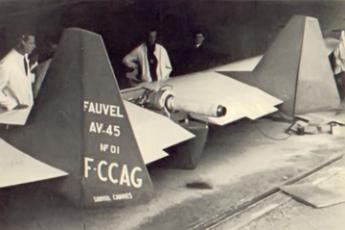 The first flight was by Charles Fauvel, and the second he was joined by Jacques Hemet Stampe as a photographer filming the event. In this form the prototype was redesignated AV 45-01R and the Eclair gave it a maximum level speed of over 140mph at 2,625ft and the maximum rate of climb 990ft/min, the time to 10,000ft being 15min. The Eclair’s battery permitted repeated restarts in flight as well as ground starting, and this turbojet was also seen as a possible powerplant for two other Fauvel tailless powered glider projects.