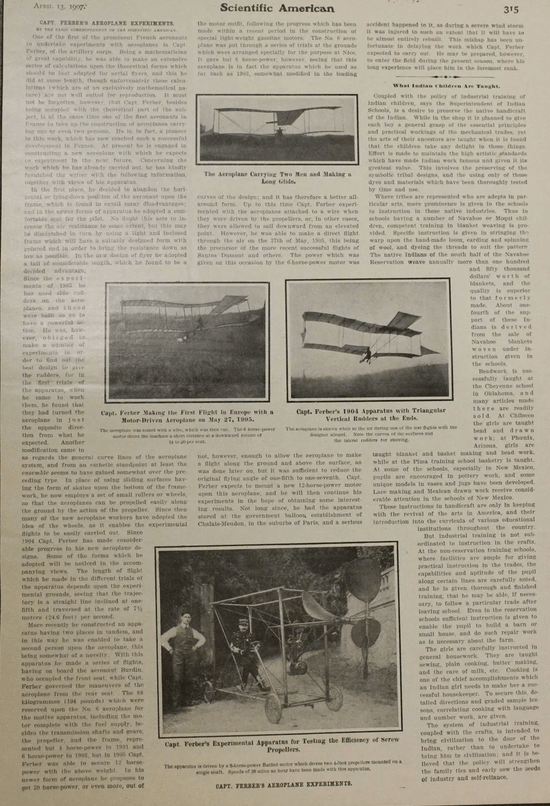 From 1904-1906, Ferber collaborated with Colonel Charles Renard at Chalais-Meudon. In 1905, he built a larger glider to which he married a 12 hp motor, and on 25 May at Chalais -Meudon he launched it from an overhead cable and made a short powered glide. Although not really a successful airplane, it seems to rank as the first rationally conceived and constructed airplane to fly in Europe.