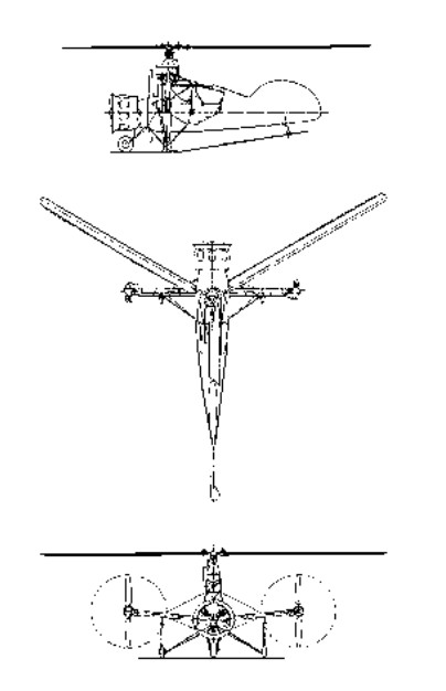 The Fl 185 was a gyroplane equipped with a three-blade rotor. Torque balance was achieved by means of variable-pitch pusher propellers driven by extension shafts located at the ends of outriggers mounted on each side of the fuselage. The starboard propeller produced backward thrust, the port forward, so that the total moment exerted on the fuselage balanced that of the main rotor. The centrally-mounted Sh.14A engine drove, in addition to the rotor and anti-torque propellers, a large cooling fan in the nose consuming about 14hp. The main gearbox was in the front part of the cockpit.