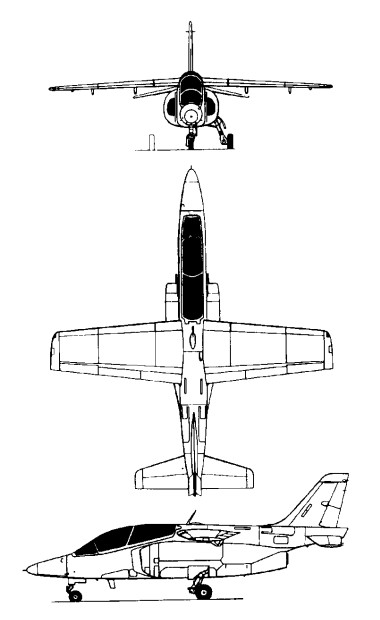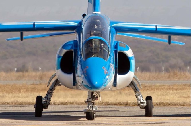 Powered by a Garrett TFE 731 turbo-fan engine providing 3500 lbs thrust, the Pampa “is capable of carrying a large and varied weapons load and a HUD and Weapons Aiming Computer System are being incorporated in future deliveries to meet Argentine Air Forces requirements”. Pampa promotional material emphasises the type’s fuel endurance of around 2.8 hours at 300 knots and a STOL/grass strip capability. Maximum speed is listed at 400 knots.