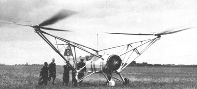 On 26 June 1936, Germany’s first successful helicopter flew, lasting 28 seconds, with test pilot Ewald Rohlfs at the controls. Professor Heinrich Focke’s Fa 61 was a true helicopter. Registered D-EBVU, the Fw 61V1 utilised a nose-mounted 160 hp Siemens engine driving two outrigger mounted fully-articulated three blade rotors via gears and torque shafts; the propeller was merely for cooling. The twin rotor blade angle could be increased or decreased so as to provide lateral movement of the aeroplane by creating a lift differential between one side and the other. Having been adapted from a Focke Wulf Stieglitz trainer, the Fa 61 none the less proved more tractable than any previous vertical lift aircraft.