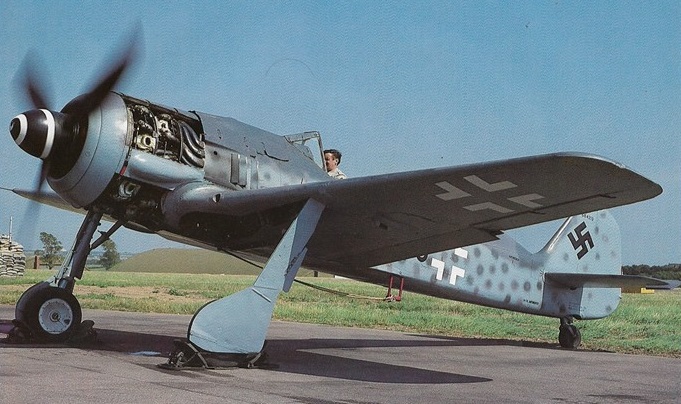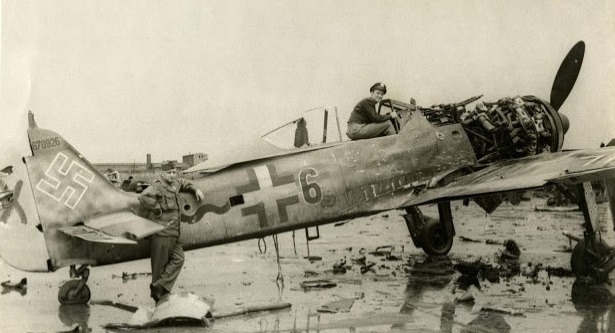 FW 190 “schwarze 16” of 8./JG 26 with Spatzwappen (sparrow emblem) seen at Wevelgem during 1943. In the cockpit is Wart Gödecker and on the right of the shot is Lt. Gerd Wiegand