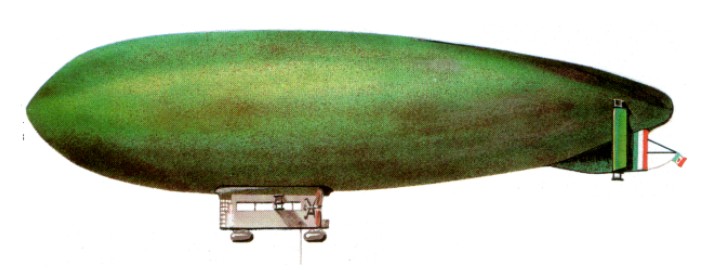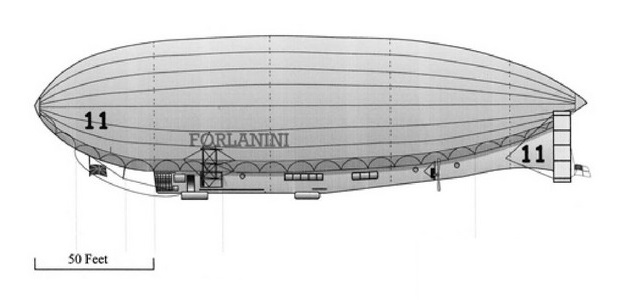 A considerably smaller Forlanini airship was the ‘P’ class (Piccolo, or small) with a fixed vertical fin and out rigged rudders at the ends of very wide span elevators. This model was 63.0 m (206 ft 8.3 in) in length, with a diameter of 12.0 m (39 ft 4.4 in).