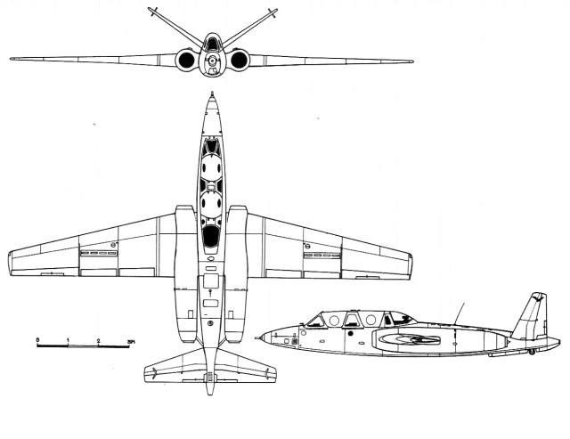 The C.M.171 was a test aircraft for a projected twin Gabizo-powered, swept-wing, butterfly-tailed trainer called the C.M.195. The Gabizo was a 1100 kg thrust turbojet, intented to power the Armée de l’air light/transonic interceptor of 1955. The C.M.170 butterfly tail for the twin engined C.M.195 was to be tested on the twin engined CM.171.