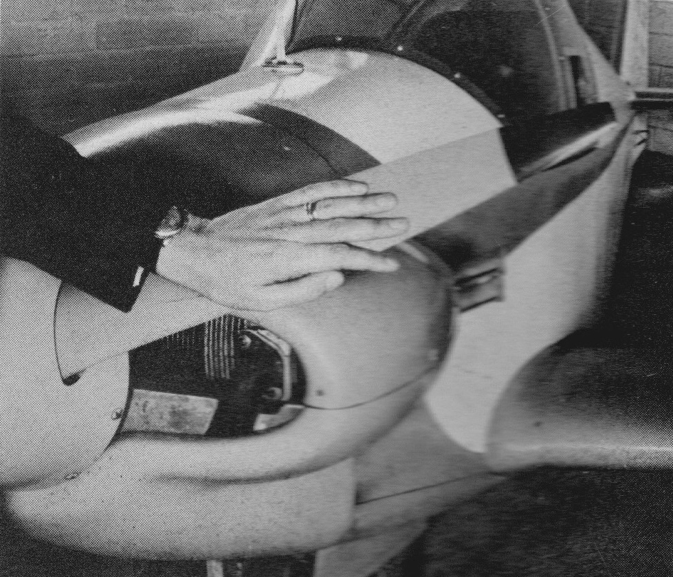 The instrument panel, though simple, has all the essentials. Blind flying gyro instruments are not included. A red stall warning light is flashlight battery powered (has test switch) since the RF-3 has neither battery nor generator. Starter and fuel cut-off knobs are at right lower panel edge. Production aircraft have engine cut-off and restarter system installed. This consists of a simple de-compression device which pushes on the exhaust valve rocker arms. With prop windmilling, the engine re-starts easily, even at very low airspeeds. A prop brake is also provided which stops the blades horizontally, covering the cowl air inlets, thus reducing drag to nearly that of a feathered prop.