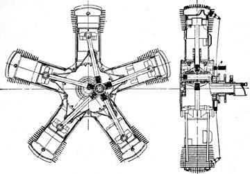 Designed by Walter Brock, the 1916 Frederickson World’s Motor Co 5A was an air-cooled, 5-cylinder rotary, 2-cycle aero engine. It produced 70hp@1000rpm from 377.7ci.