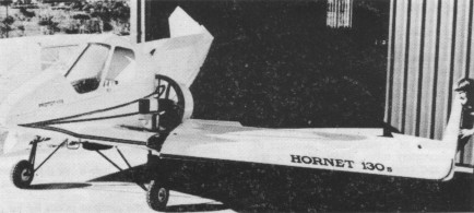 From that prototype the Hornet 130S evolved – a tail-less composite-construction machine with a tapered swept-back wing and ailerons which can be used together to act as elevators, in a similar fashion to the stabilators of a Mitchell Wing B10. Like the latter, yaw control is by tip rudders.