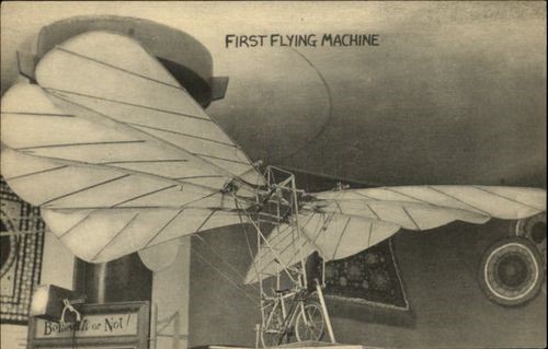 As a youth living in Russia, Oskar Freymann had observed eagles in flight and determined to build a flying machine based on the actions he saw. After emigrating to America in 1895 he worked in a bicycle shop in Brooklyn. Freymann soon built his flying machine, with four wings operated by the pedaling action of a bicycle, and handle bars that moved a rudder at the rear. In November 1896, Freymann and three other men trucked the machine to an open field in Flatbush. He claimed to have pedaled furiously and flown the ornithopter to an altitude of 14 feet – but this is quite doubtful. In any event the machine was damaged during the trial and never rebuilt. Freymann ultimately planned on building a larger, gasoline-powered ornithopter on a tricycle, but ran out of money and abandoned the project. The model – seen here in 1939 on display at the Ripley’s “Believe It or Not!” Odditorium in New York – was built by Freymann in 1895, to help him work out the wing-flapping system. It currently resides at the Cradle of Aviation Museum in East Garden City, New York.