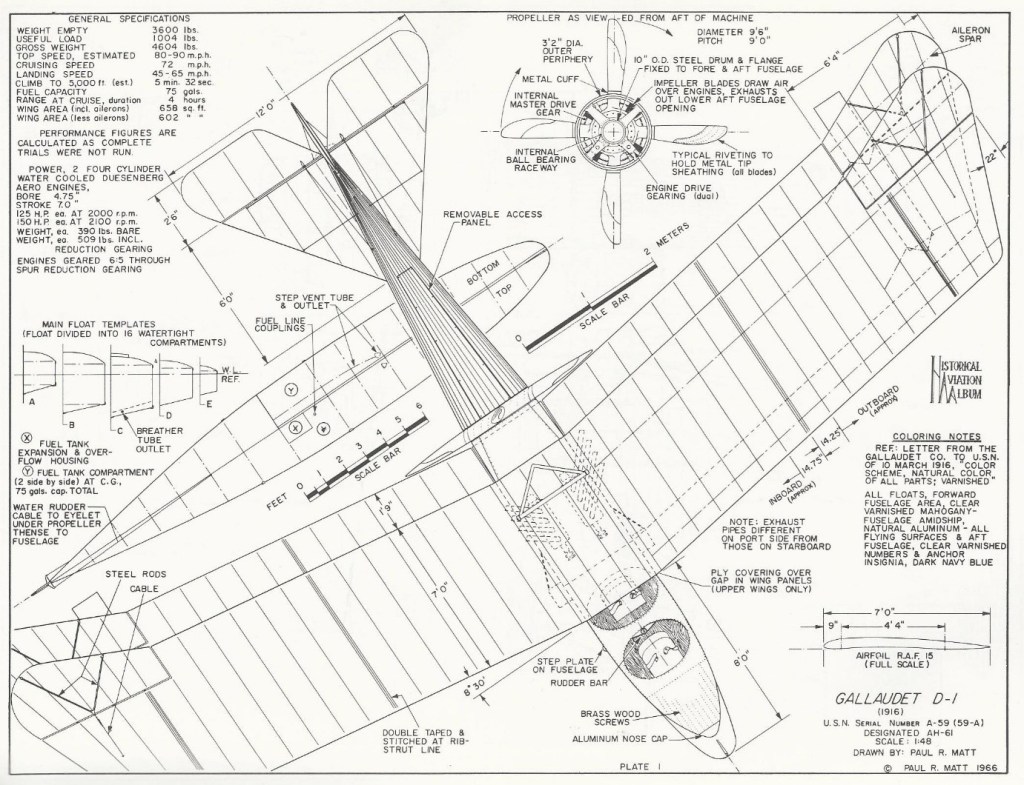 In response to a requirement by the U.S. Navy for light floatplanes capable of being launched off catapults by ships underway, the Gallaudet Aircraft company began development of the “D-4”, based on the earlier Gallaudet D-1. The D-1 (A59) was powered by two 150 hp Duesenberg engines mounted side by side, and first flown on 17 July 1916. Following delivery of the D-1 in January 1917, the firm reorganized as Gallaudet Aircraft Corporation, and moved to Greenwich, Rhode Island.