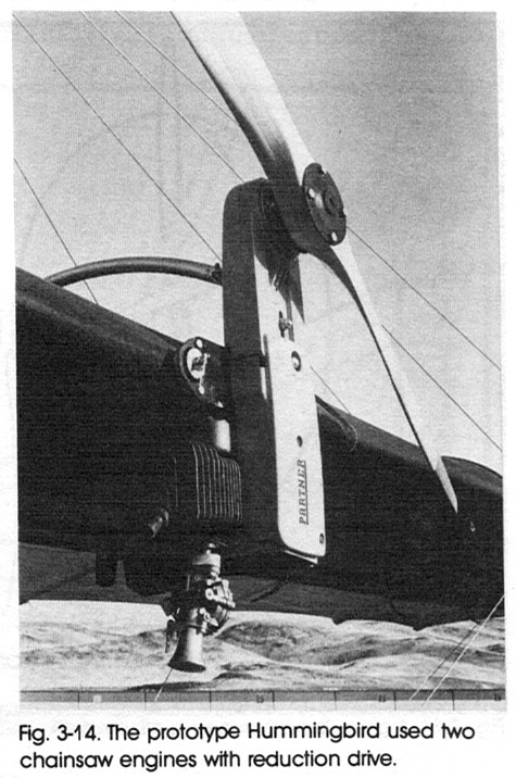The Tractorplane is a utility ultralight version of Prospector. The Sport Hummingbird is a mono-wing with upright V-tail. Mixed three-axis controls make use of true ailerons for roll control and a separate elevator on the V-tail for pitch control. Construction is aluminum-tubing frame with the wings and tail surfaces covered with presewn 3.8-ounce Dacron. The engines are mounted in tractor position on the leading edge of each wing, and operated separately. Reduction drive turns each two-blade wooden Gemini propeller. Fuel tank is polypropylene. LANDING GEAR: Solid tricycle with steerable nosewheel. Wheels measure 16 inches.