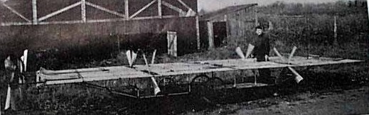Trussed frame of light aluminium tubing reinforced by piano wire 24 feet overall with a beam of 10 feet, covered in light duck and steered by two integrated flaps.