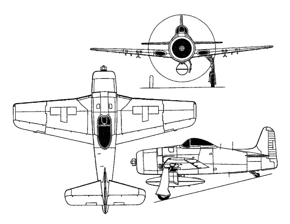 Two prototypes, designated XF8F-1 and named Bearcat, were ordered on 27 November 1943, and the first flew on 31 August 1944. It marked a complete break with previous Grumman fighters, the only points of similarity being the portly fuselage and bluff engine, and the broad wing of generous area. Apart from those characteristics the XF8F was new, quite apart from being remarkably compact. The wing span was only 35ft l0in and the overall length 28ft 3in, and it was an extremely simple and uncluttered design. The single main spar ran straight from tip to tip and the engine firewall was in line with it. The centre of gravity of the loaded aircraft was eight inches in front of this point, emphasising how close-coupled the whole aircraft was. The wing was made in one piece, only the tips being arranged to fold straight up and over, and the top of the wing formed the floor of the cockpit. The seat was mounted straight on the wing, and pilots added their own personal cushion(s) so that they had a good view from the high teardrop canopy. The main landing gear retracted straight inwards, the small wheels with high-pressure tyres being housed in the wing root leading edge. A novel idea, later abandoned, was to arrange that, if the wing suffered vertical acceleration exceeding 8.5g, the outer 3ft of each wing would break off (preventing a catastrophic breakage at the root).