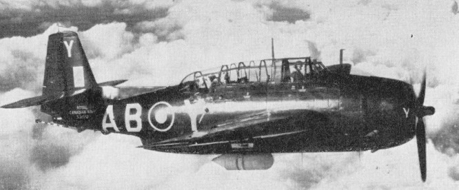 Avengers in service with the Royal Canadian Navy in 1955 were ex-U.S.N. aircraft, modified by Fairey Aviation of Canada. Some retain original ballshape gun turret at rear of glasshouse. Others are unarmed. All carry a radome cannister under starboard wing.