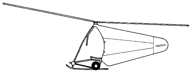 These modifications produced the Rotachute Mk. II, with two small wheels carried on an axle below the centre of gravity (the forward end of the landing skid provided the third point of contact). The original rear fuselage fairing, as already described, comprised a rubber fabric bag with air scoops to maintain inflation during flight. With the need to lengthen this fairing, the frameless construction was no longer acceptable because the flexible bag might foul the rotor. Therefore the Rotachute Mk.II had a single wooden member running round the profile of the tail fin, with vertical members interspaced and covered with rubber fabric. The tailplane was wholly flexible and the entire fairing inflated through ram effect with forward speed.