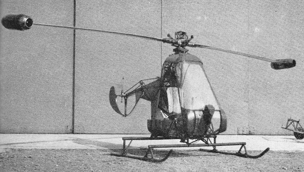 First flown in late September, 1958, the JHX-4 is a single-seat light helicopter with a two-blade main rotor which is driven by tip-mounted ramjet engines.