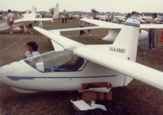The “Minibat” ultralight single-seater glider was designed by Larry Haig of Muskegan, Michigan, over a three-month period at a cost of $3,500, and made its first flight on March 11, 1979. The Minibat had a cantilever, swept forward wing and used a reflex airfoil. It was constructed of Kevlar, carbon fibres and foam sandwich with glass fibre covering. The fuselage was made up of two halves joined by the metallic structure which formed the pilot’s seat. Wings were demountable in the same way as a conventional glider, and a peculiarity of this machine was that the two ailerons could be raised together to act as spoilers. Extended wing tips were also available, increasing span to 10 meters.