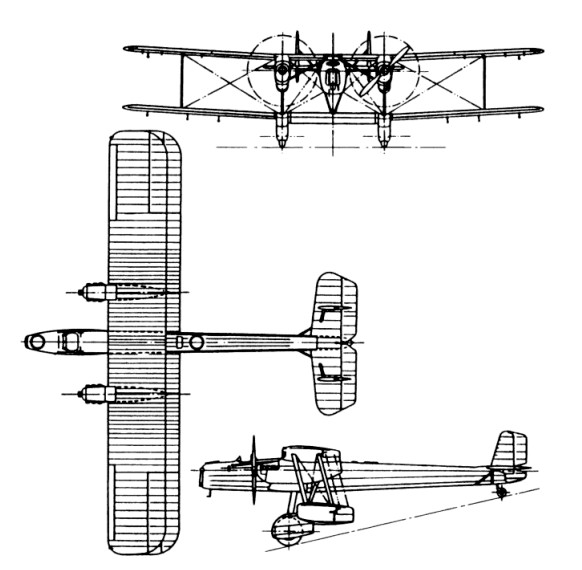 Bombs of various sizes were carried inside the thickened centre-section of the lower wing, each bomb being carried in a separate cell closed by spring doors. The fixed landing gear comprised two large wheels faired into the lower wing.