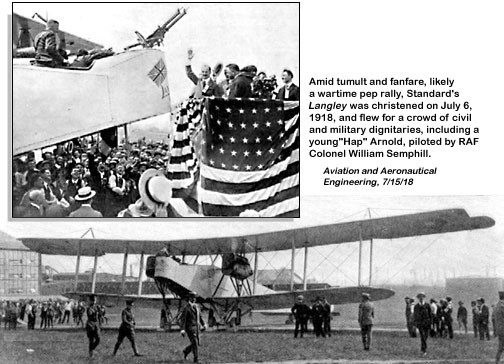 One early O/100 sample component (airframe B9449) was assembled by Standard Aircraft Corp in the US for publicity purposes and dubbed Langley, adorned with crossed British and American flags on the nose and its name on the sides, flew to 3500′ in a half-hour demonstration flight for a crowd of 5,000.