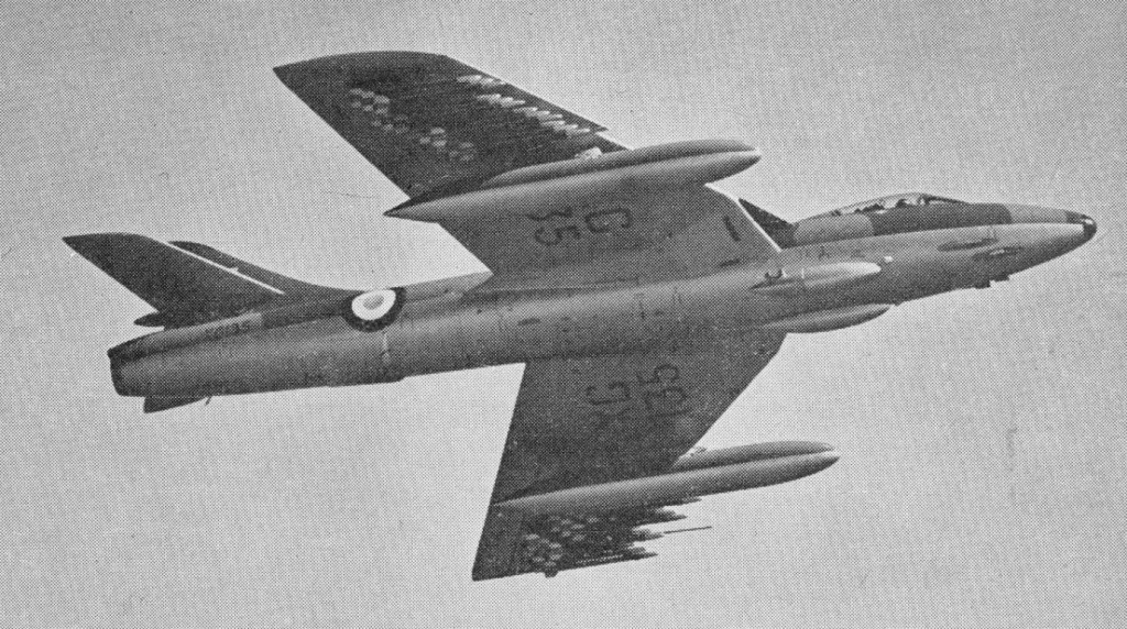 The first production F.Mk.1 powered by the 3425-kg (7,550-lb) thrust Avon 113 flew on the 16th of May, 1953, but this and a further 22 early production aircraft were used for development purposes. Like Supermarine’s troublesome Swift, problems began to arise. The use of the flaps as airbrakes turned out to cause a severe nose-down pitching at high speeds, and after much work a simple hinged brake was fitted to the fuselage underside. However even this was troublesome and had to be disabled when the landing gear was down. Cannon firing was restricted to low altitudes because exhaust gas from them could cause the engine to flame out. The Sapphire engined variant, the F.2, did not suffer from this.