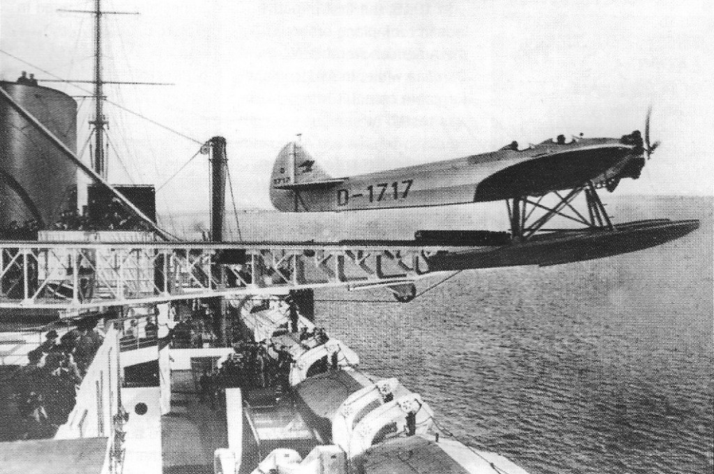 The concept was hit upon after Norddeutscher Lloyd (NDL) had carried a Junkers F.13 seaplane aboard the Lutzow during 1927 to provide joyrides for passengers when the liner was in port. NDL officials realised that a seaplane based on a liner could have a more practical commercial application, taking off with the liner’s airmail while still a long distance from port, therefore drastically cutting down time taken for the mail to arrive. Heinkel designed a catapult, which NDL planned to install on its new liners, the Bremen and Europa, and an aircraft to carry the mail. Since the crew of Lutzow had trouble providing the necessary maintenance for the F 13, Deutsche Luft Hansa agreed to provide the operational support for the venture, and when Bremen departed on her maiden voyage in 1929, a single HE 12 (D-1717) was carried aboard.