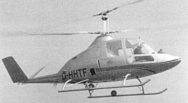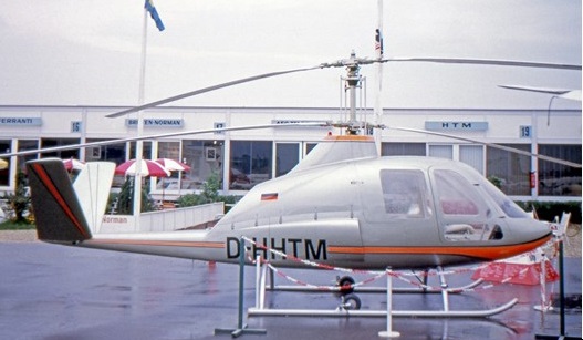 After extensive development work had been carried out, the Wagner designs were passed to a new company, Helikopter Technik Munchen (HTM) in 1971. HTM abandoned the Aerocar, but built a new prototype of the FJ-Sky-Trac (D-HHTM) in tandem two-seat configuration, as a utility helicopter with a 260hp Lycoming IO-540 engine. This still had the coaxial rotor system but was extensively redesigned to accommodate the new engine and cockpit layout.