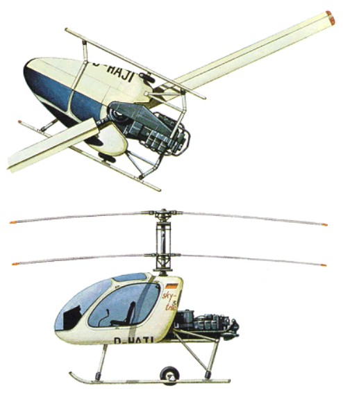 The three-seat Sky-Trac 3 (D-HAJI c/n 11), also flown in 1965, had a more complete cabin structure, faired-in at the back and underneath, and was fitted with spray bars and under-slung tanks for agricultural chemicals. The Sky-Trac 3 can lift loads at least equivalent to its own weight, an under-fuselage hook permitting slung loads of over 700kg to be transported. Alternatively, the heart-shaped cabin can accommodate a stretcher and medical attendant in addition to the pilot, or for agricultural use can be fitted with spray bars and an under-slung tank holding 650 litres of liquid chemicals.