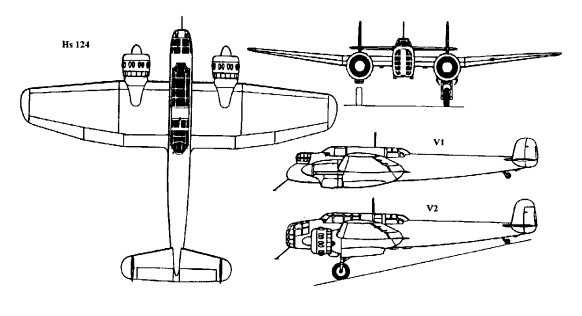 The 1936 twin-engined strategic fighter, competing for orders with the Fw 57 and Bf 110, was heavier than the Bf 110 and Fw 57, the glazed nose seating a gunner. For its size the Hs 124 was an agile and fast aircraft, but Luftwaffe requirements were better fulfilled by the Bf 110. Three HS 124 were built.