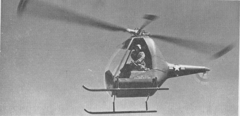 Although the new military helicopter shared the name and designation of the original HJ-1 “Hornet”, it was an all-new machine with no commonality. It had lightweight skids, and it had rudder pedals controlling a single-blade tail rotor. While not needed to offset torque, the tail rotor – which furnished crisper yaw control than was provided by the earlier Hornet’s rudder – helped during autorotation and permitted rapid sideways flight as required by increasingly stringent military control requirements.