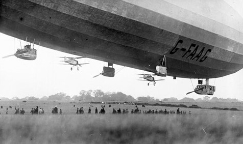 In October 1925, following repairs, she was used for experiments to provide data for the construction of the R101 airship. Once these were finished, in mid-October, she was used for trials launching a parasite fighter, using a DH 53 Hummingbird light aircraft. After some near misses, a successful launch and recapture was achieved in December that year. The following year she launched a pair of Gloster Grebes weighing about a ton apiece, the first of which was flown by Flying Officer Campbell MacKenzie-Richards. She was then sent to the sheds at Pulham where she was finally broken up in 1928, after “severe” metal fatigue was found in her frame. The forward portion of R33’s control car is on display at the RAF Museum at Hendon.