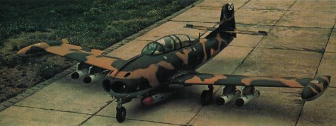 HA 200 Saeta development potential as a lightweight ground attack aircraft lead, via the two seat HA 200E Super Saeta with more powerful Marbore engines, to the purpose built, single seat HA 220 Super Saeta, with increased armour, self¬-sealing fuel tanks and an additional fuel tank in the rear cockpit, replacing the second seat. Powered by two 1,058 lb thrust Marbore VI engines, the rear cockpit is used to accommodate an additional fuel tank. Armament can comprise a variety of bombs, guns, and rockets on under-¬fuselage/wing stations.