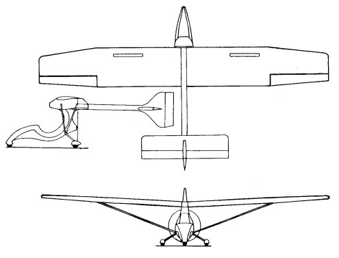 Single seat single engined high wing mono¬plane with conventional three axis control. Cruciform tail. Pitch control by elevator on tail; yaw control by fin mounted rudder; roll control by half span ailerons; control inputs through stick for pitch/roll and pedals for yaw. Wing braced from below by struts; wing profile Worth¬mann FX63 137; double surface. Undercar¬riage has three wheels in tricycle formation; suspension on nosewheel and glass fibre suspension on main wheels. Push right go-¬right nosewheel steering connected to yaw control. Brake on nosewheel. Glass fibre/ carbon fibre fuselage, partially enclosed. Engine mounted below wing driving pusher propeller.