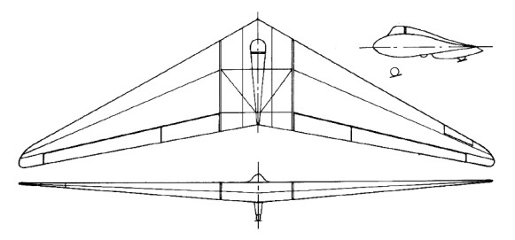 The Horton Ho.2 was of the same general layout as the H I but with sweepback increased from 19 degrees to 26 degrees and the lateral and longitudinal control combined in an elevon. Inboard flaps extending from elevon to center section were used to increase maximum lift and drag for landing.