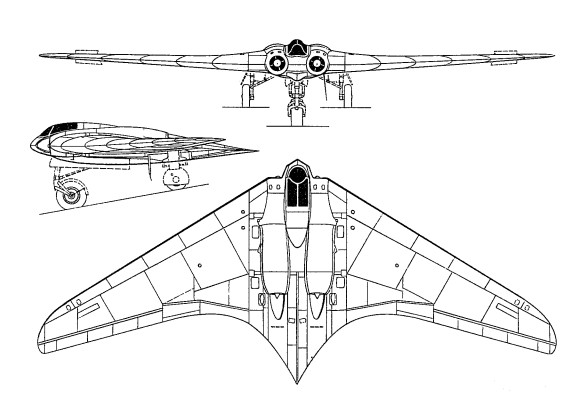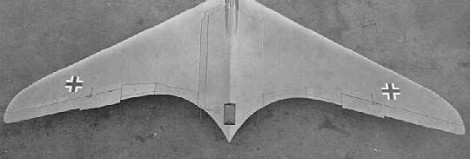 In shape, the H IX was a pure wing with increased chord at the center to give sufficient thickness to house the pilot and the jet units, which were placed close together on either side.