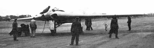 The jet engines were installed at -2° to the root chord and exhausted on the upper surface of the wing at 70% back from the nose. To protect the wings the surface was covered with metal plates aft of the jet pipe and cold air bled from the lower surface of the wing by a forward facing duct and introduced between the jet and the wing surface. The installation angle was such that in high speed flight the jest were parallel to the direction of flight.