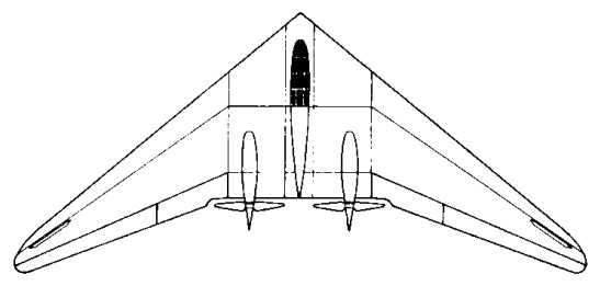 Outer wing panels were of the same aerodynamic shape as those of the H V. At the center line the section was 16% thick with 1.8% camber (zero Cmo) graded to 8% symmetrical tip sections. Wing twist was 5 degrees; 2 degrees linearly and 3 degrees parabolically distributed. The aircraft trimmed with elevons neutral at 260 kph (CL = 0.16).