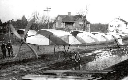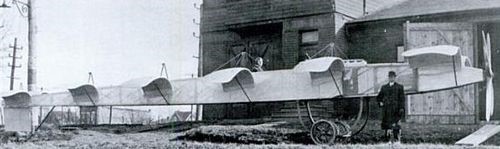 A multi-wing aeroplane designed and built by Howard Huntington sometime during 1912/1913. The photo shows Huntington in front of his house in Hollis, Queens, on January 22, 1914.