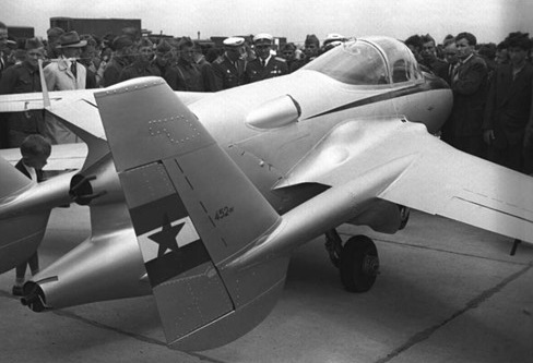 Among these, the 452M was designed by engineer Dragoljub Beslin, considered the prototype of a ground attack fast jet. The letter M (Mlazni) means jet powered. The 452M was a stubby pod-and-boom configuration with twin tails and a horizontal stabilizer at the end of the booms. The power source consists of two Turboméca Palas 056A turbojet engines arranged one above the other at the rear of the fuselage.