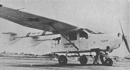 The XL-15 Tagak was the second of these prototypes, developed in collaboration with the Philippine Air Force, it was designed by Antonio J. de Leon as a utility, liaison or ambulance aircraft and as a test bed for the use of local materials in aviation. It was a single-engine, high-wing monoplane with a twin-boom layout and tricycle undercarriage to enable easy access to the fuselage pod via rear doors. The inner wing sections, fitted with slotted flaps on the trailing edges had constant chord but further out the wings tapered, with slotted ailerons. There was a single lift strut on each side between wing and lower fuselage, with an airfoil profile to add to the lift from the wings.