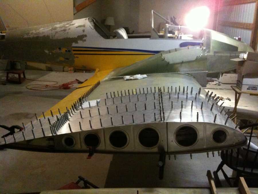 By January 2013, both nacelles complete. Custom motor mounts being fabricated. Riveting right wing extension now, left wing extension riveting to follow. Center console 75% complete. Fabricating nose gear/baggage shelf in next few weeks. All fibreglass work still in rough stages of completion…lots of filling & sanding ahead.